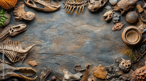 © Aliaksandra, Naklejka premium banner with space, featuring dinosaur bones and artifacts, illustrating the prehistoric era concept
