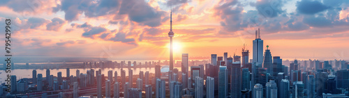 © Odin, Fototapeta premium Banner with sunset over urban river with skyscrapers. Generative AI
