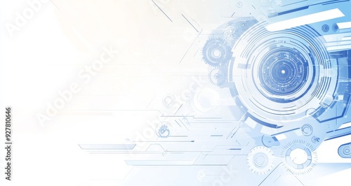 Obraz premium Banner with White and Blue Color Scheme Featuring Gears, Geometric Shapes, and Digital Elements