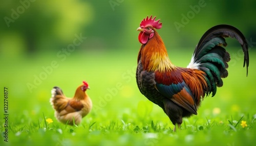 © สิริวุฒิ นาคโคตร, Fototapeta premium Bantam rooster crowing in a lush green meadow with a small chicken, landscape, scenery