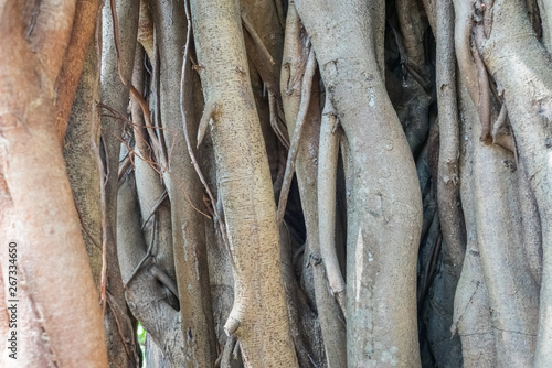 Fototapeta premium Banyan tree roots Closeup. Twisted roots of an old tree formed authentic natural pattern. Banyan tree trunk close up. Detailed texture of the banyan tree bark for background.