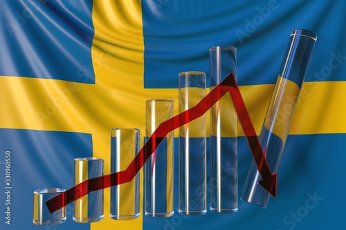 © Alexey Novikov, Fototapeta premium Bar chart with downward trend against flag of Sweden. Financial crisis or economic meltdown related conceptual 3D rendering
