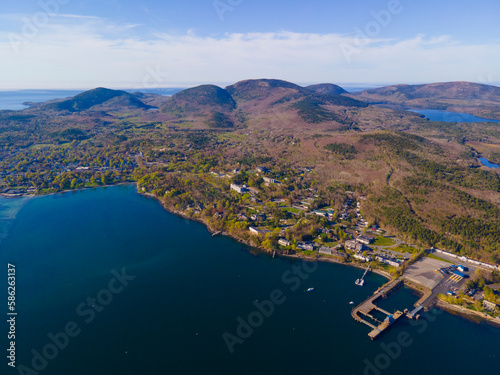 © Wangkun Jia, Obraz premium Bar Harbor Ferry Terminal aerial view with Cadillac Mountain in Acadia National Park at the background on Mt Desert Island, Bar Harbor, Maine ME, USA.