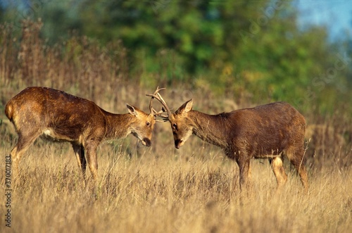 Naklejka premium BARASINGHA DEER OR SWAMP DEER cervus duvauceli, MALES FIGHTING