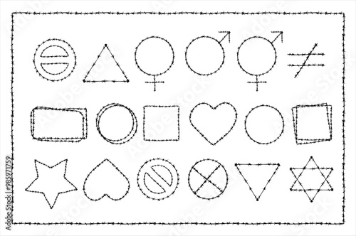 © MintArt, Fototapeta premium Barb wire shapes, border and pattern texture design vector graphic. Basic geometric shapes collection vector set. Brush and stroke vector design.