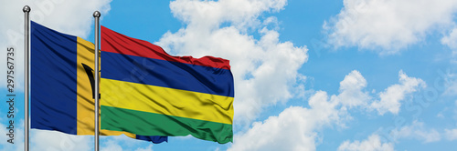 © sezerozger, Naklejka premium Barbados and Mauritius flag waving in the wind against white cloudy blue sky together. Diplomacy concept, international relations.
