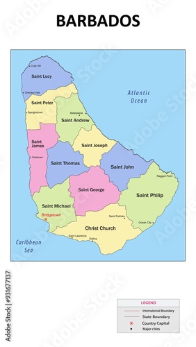 © awesome artt, Fototapeta premium Barbados Map. State and union territories of Barbados with neighbouring countries. Political map of Barbados with capital and important cities in Detailed.