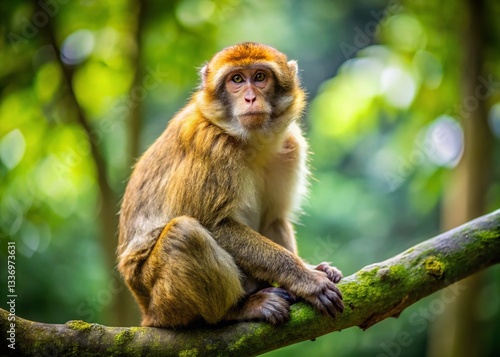 © Man888, Obraz premium Barbary Ape in German Park: Bokeh Nature Photo - Brown Monkey on Tree