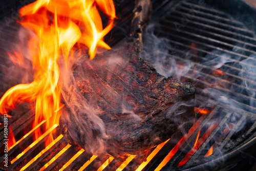 © HLPhoto, Fototapeta premium Barbecue dry aged wagyu tomahawk steak offered as close-up on a charcoal grill with fire and smoke
