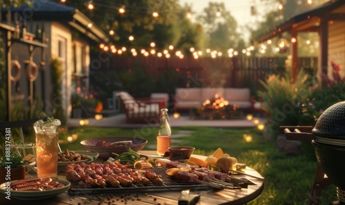 Fototapeta premium Barbecue party in a backyard with grilled food, drinks, and casual outdoor seating