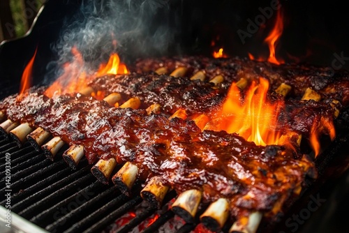Fototapeta premium barbecued pork ribs on a fiery grill, with flames and smoke enhancing the...