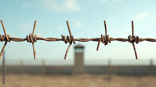 © A2Z AI , Fototapeta premium Barbed wire barrier against a pale blue sky. Securing the perimeter of a facility with its rusty metal. Implying confinement and security.