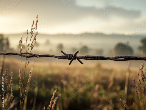 © Mr. Orsetto, Obraz premium Barbed wire fence in a rural landscape during early morning mist