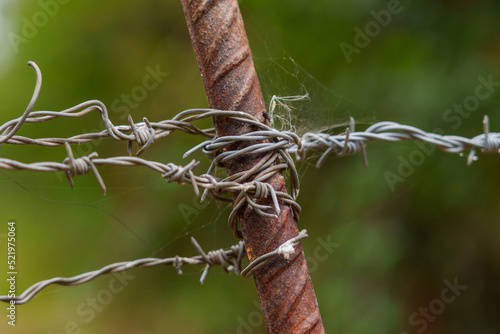 Fototapeta premium Barbed wire fence with steel sharp barbs on a eco farm with beautiful nature