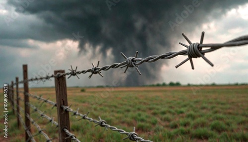 Fototapeta premium Barbed Wire Fence with Tornado Debris