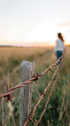 © Lisicus, Fototapeta premium *Barbed wire fence with woman walking at sunset in field. Rural landscape, summer, loneliness concept.**