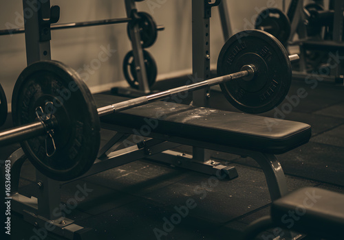 © Ramdhaniyah, Fototapeta premium Barbell and weights in gym interior