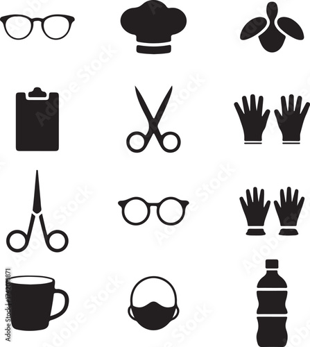 Fototapeta premium Barber and Chef Icon Set - Tools Icon Collection – Scissors, Glasses, Gloves, and Bottle