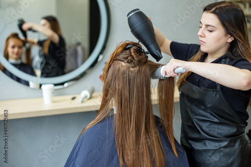 © Olha Tsiplyar, Naklejka premium barber dries his hair., cuts her hair to a girl with long hair. a woman dyes her hair, dries her hair with a hair dryer