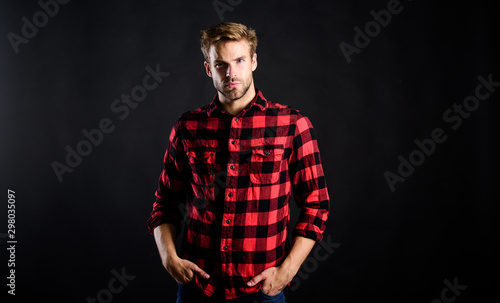 Naklejka premium Barbershop and beauty salon. Hipster black background. Standards of manliness or masculinity. Handsome well groomed man in checkered shirt. Manliness concept. Meaning of modern manliness. Male beauty