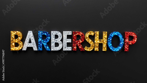 © Erlinda, Obraz premium Barbershop word lettering made of colorful glitter shining effect on plain black background