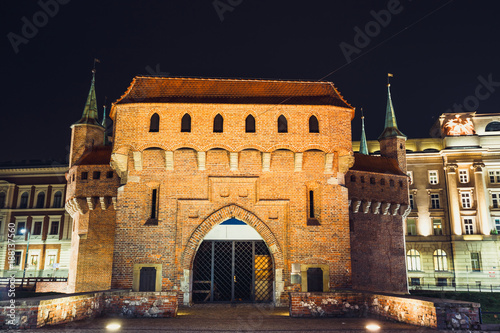 Fototapeta premium Barbican fortress in the historic center of Krakow at night, Poland