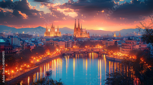 © Novanture, Fototapeta premium Barcelona, Spain city skyline created with Generative AI technology