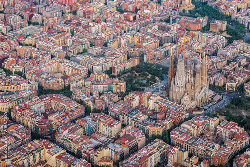 Obraz premium Barcelona z lotu ptaka dzielnicy mieszkalnej Eixample i Sagrada Familia,...