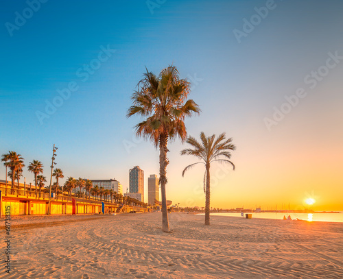 Obraz premium Barceloneta Beach in Barcelona at sunrise