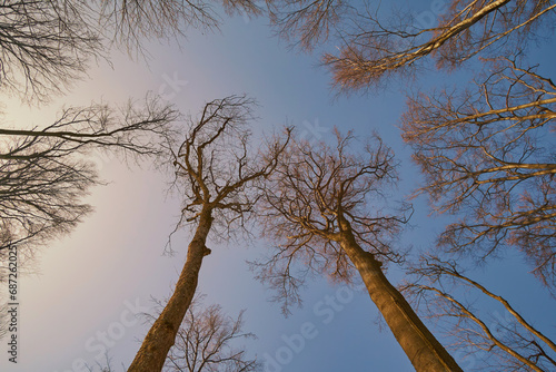 © Rejdan, Obraz premium Bare beech branches, bottom view. Winter forest scene