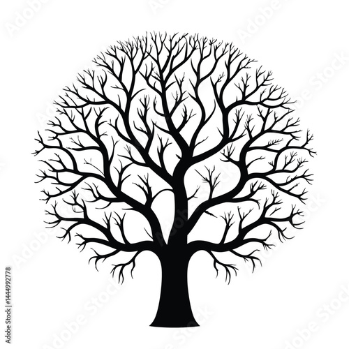 © Shipon, Fototapeta premium Bare Black Tree Silhouette Isolated on White, Circular Crown and Branch Structure