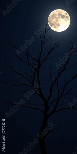 © Chalermrach, Fototapeta premium Bare branches of a solitary tree stretch towards a moonlit night sky, tree, nocturnal