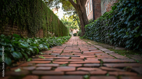Fototapeta premium Bare brick pathway with ivy-covered wall beside it - Simple and historic