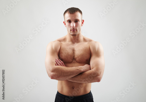 © ArtFamily, Fototapeta premium Bare-chested man is standing with crossed arms.