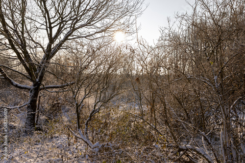 Obraz premium Bare deciduous trees in the forest in winter
