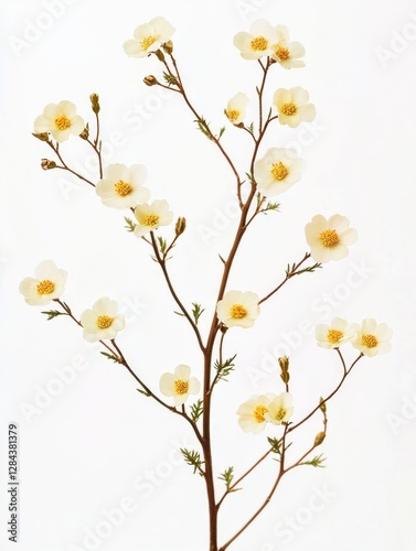 Fototapeta premium Bare stems with yellow flowers against a white background.
