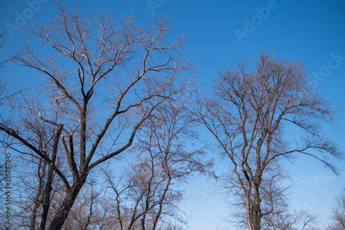Fototapeta premium Bare tree branches against the blue sky..