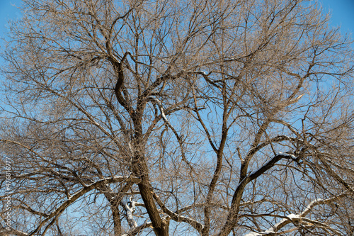 Obraz premium Bare tree branches on a blue sky background