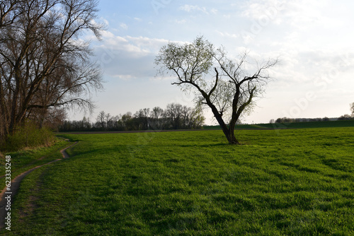 Obraz premium Bare tree in a green field under a light cloudy sky