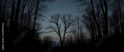 © Yury, Fototapeta premium Bare tree silhouettes against a twilight sky creating a serene and haunting atmosphere while surrounding an open space filled with subtle shadows