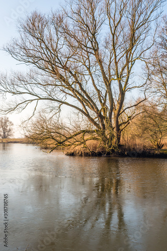 © Ruud Morijn, Obraz premium Bare tree with irregular branches reflected