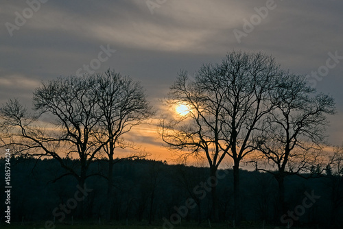 Fototapeta premium Bare trees against a colorful sunset sky in the east Belgian countryside.