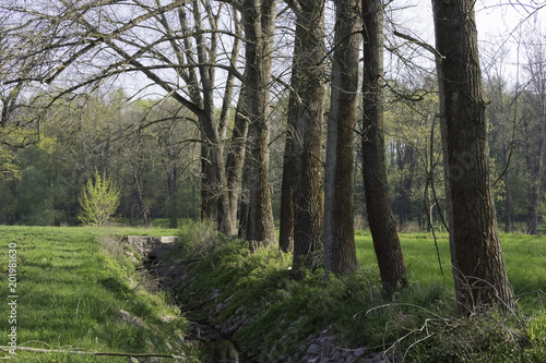 © Elena, Fototapeta premium Bare Trees in a Row near Water Stream in the Forest