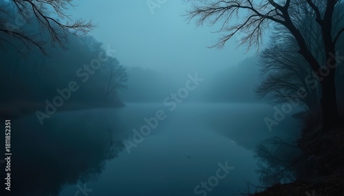 © Viktor, Fototapeta premium Bare trees stand by dark misty lake at night. Calm blue water reflects bare branches and deep fog. Serene mysterious nature scene unfolds under moonlit sky.