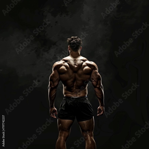 © ConceptStudio, Fototapeta premium Barechested bodybuilder showcasing muscular chest and thighs in event darkness
