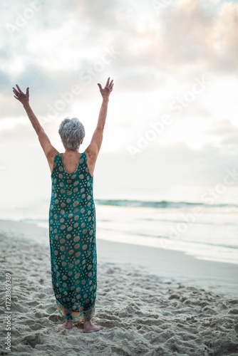 © wavebreak3, Naklejka premium Barefoot senior woman raising arms toward sky on sandy beach by calm sea, under cloudy sky