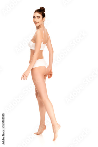 Fototapeta premium barefoot woman with perfect body looking away and walking on white