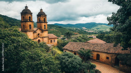 © Andres Mejia, Fototapeta premium Barichara cathedral surrounded by lush green vegetation in colombia