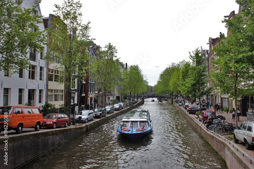 Obraz premium Barka płynąca po kanale w Amsterdamie