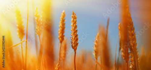 © zwiebackesser, Fototapeta premium Barley field background against blue sky and sunlight. Agriculture background.